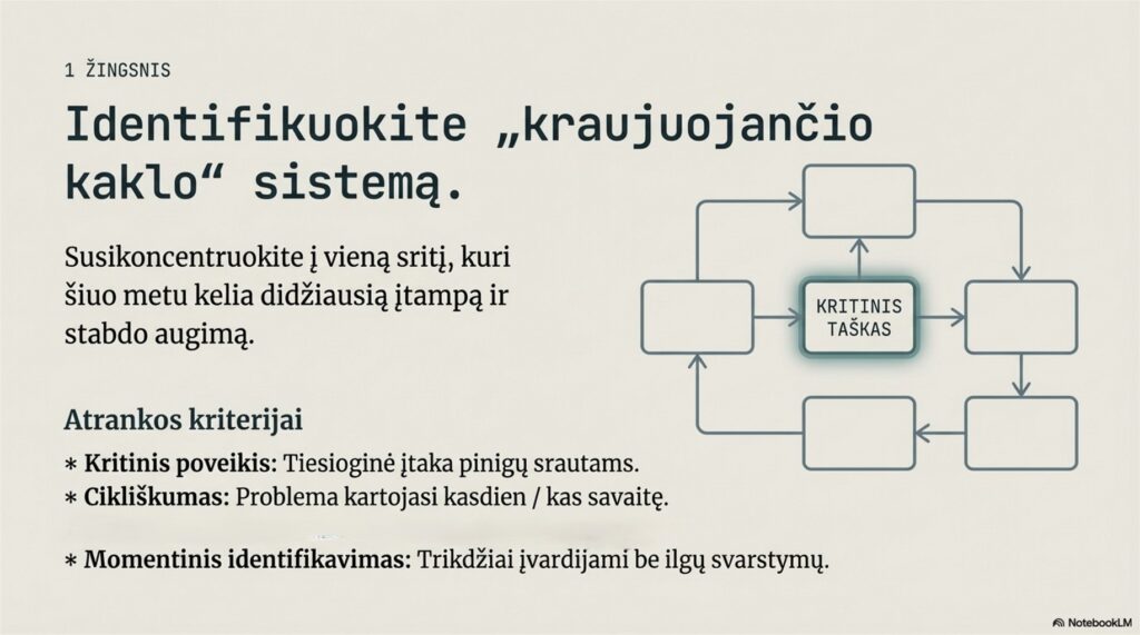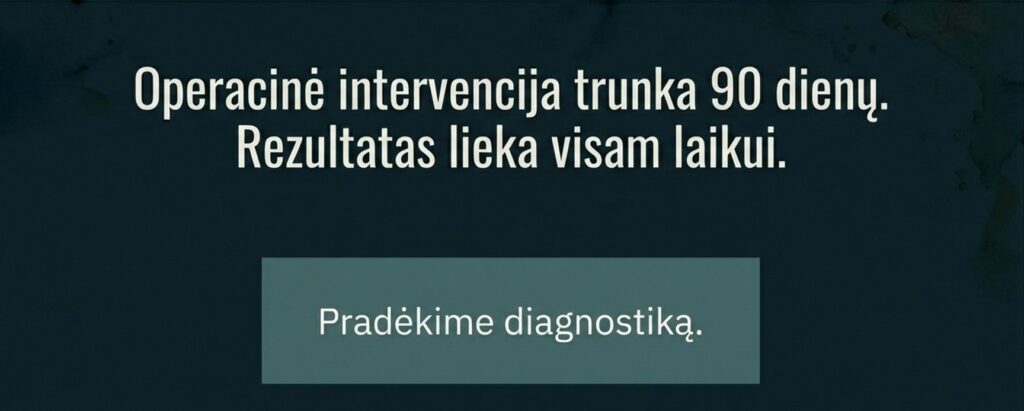 Tai – operacinė intervencija. Identifikuojame jūsų „kraujuojančio kaklo“ sistemą ir lokalizuojame aukščiausios įtampos mazgą – konkrečią struktūrinę problemą, stabdančią augimą. Tik po šios diagnozės projektuojame DI įgalintą darbo eigą ir sukuriame inžinerinius artefaktus, kurie tampa integralia, valdoma ir jūsų įmonei priklausančia intelektinio turto dalimi.