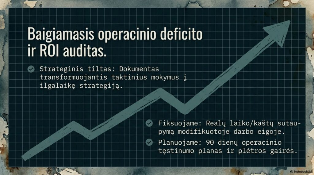 Mūsų partnerystės ciklą vainikuoja kiekybiniais rodikliais pagrįstas vertinimas – baigiamasis auditas, kuris tampa jūsų įmonės intelektine nuosavybe. Mes ne tik užbaigiame sesijas, bet pateikiame objektyvizuotą investicijų grąžos (ROI) metriką, gautą išsprendus konkretų „kraujuojančio kaklo“ procesą.