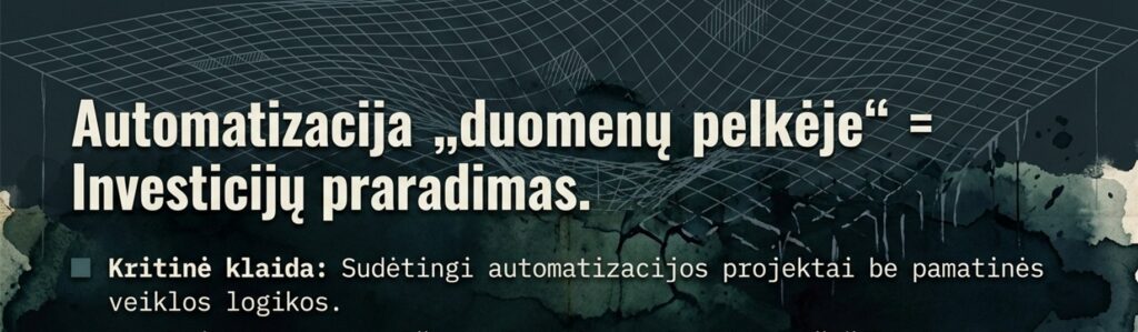 Bandymas diegti automatizacijos sistemas „duomenų pelkėje“ dėsningai baigiasi investicijų praradimu. Nepasiekus lūkesčių, įmonė nusivilia rezultatais, komandose grįžtama prie nekontroliuojamo „šešėlinio DI“ taikymo, o pati organizacija praranda galimybę sukurti tvarų konkurencinį pranašumą.