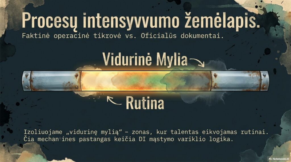 Ši diagnostika leidžia tiksliai izoliuoti „vidurinę mylią“ – specifinius struktūrinius trinties taškus, kuriuose aukščiausios kompetencijos specialistai priversti eikvoti laiką rutininiams veiksmams. Identifikavę šiuos procesų trūkius, mes nustatome zonas, kuriose mechanines žmogaus pastangas privalo pakeisti DI mąstymo variklio logika. Taip improvizacija transformuojama į standartizuotą, duomenimis grįstą darbo eigą.