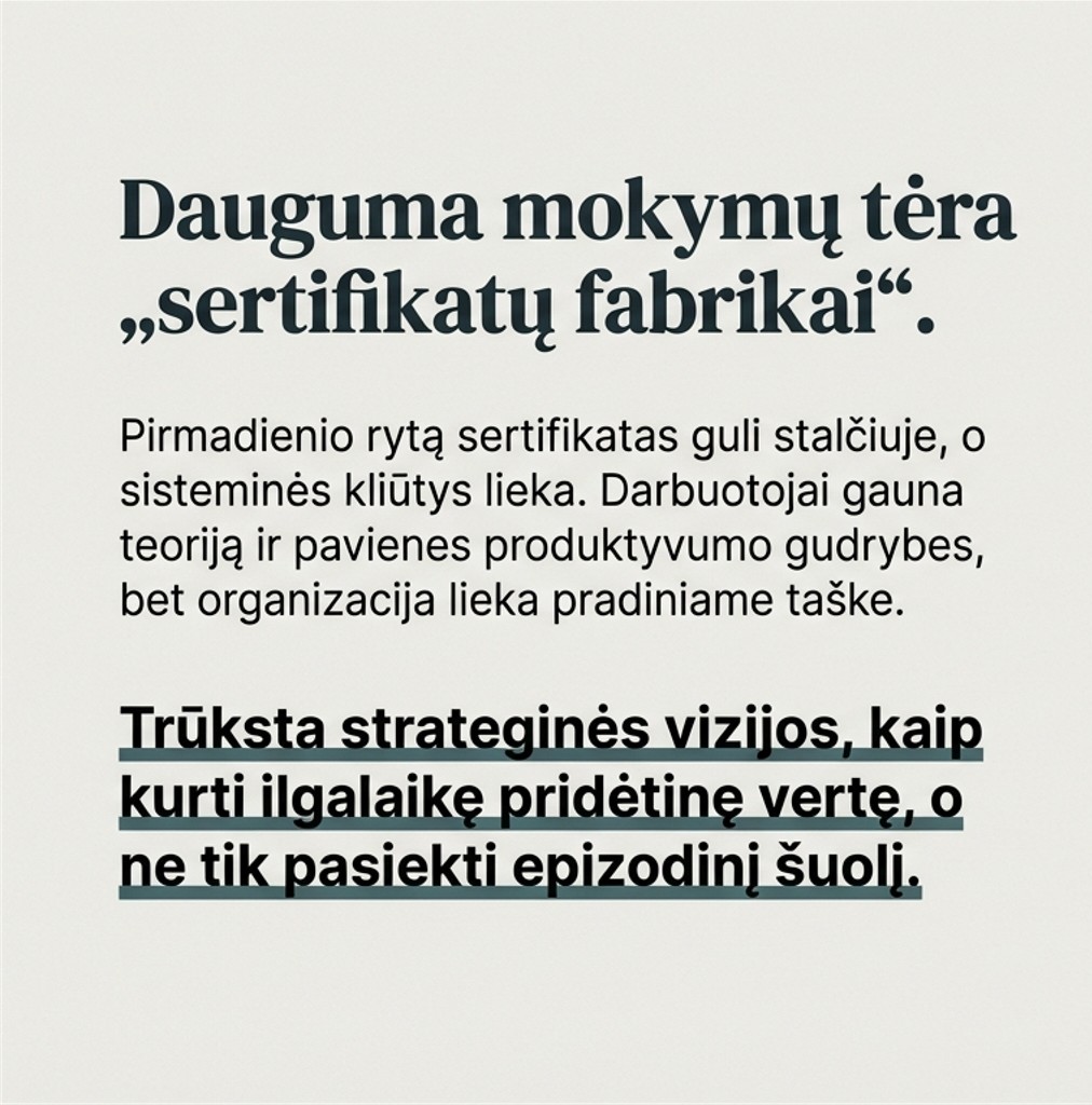 Dauguma dirbtinio intelekto mokymų šiandien tėra „sertifikatų fabrikai“. Mokymų seminaras ar programos išklausymas darbuotojams suteikia tik keletą pavienių produktyvumo gudrybių. Tačiau pirmadienio rytą organizacinė aplinka lieka nepakitusi: sisteminės veiklos kliūtys niekur nedingsta, o dėmesį eikvojanti rutina ir toliau stabdo realią transformaciją.