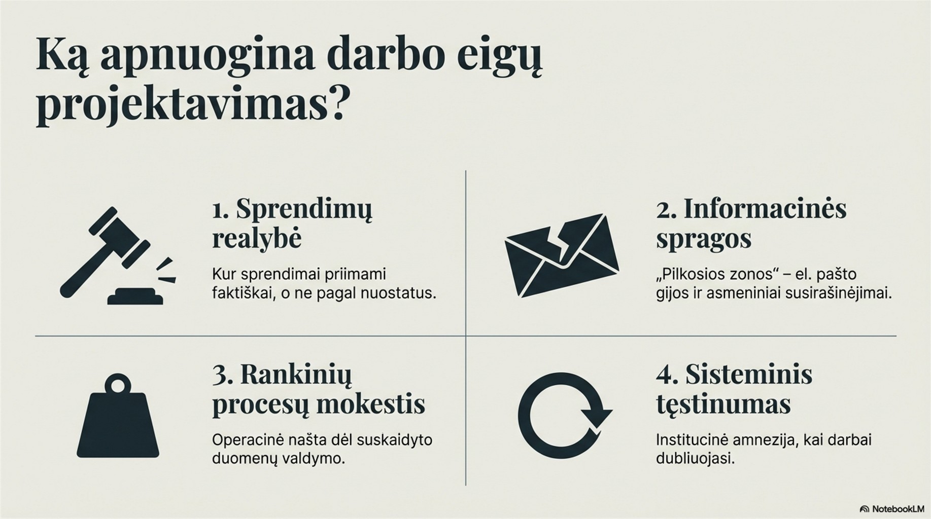 - Sisteminis tęstinumas: kur darbai dubliuojasi dėl institucinės amnezijos ir procesų sąsajų trūkumo.