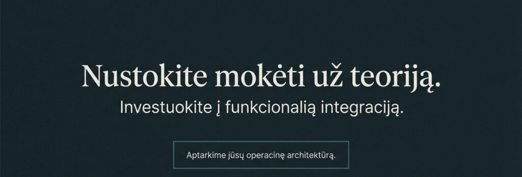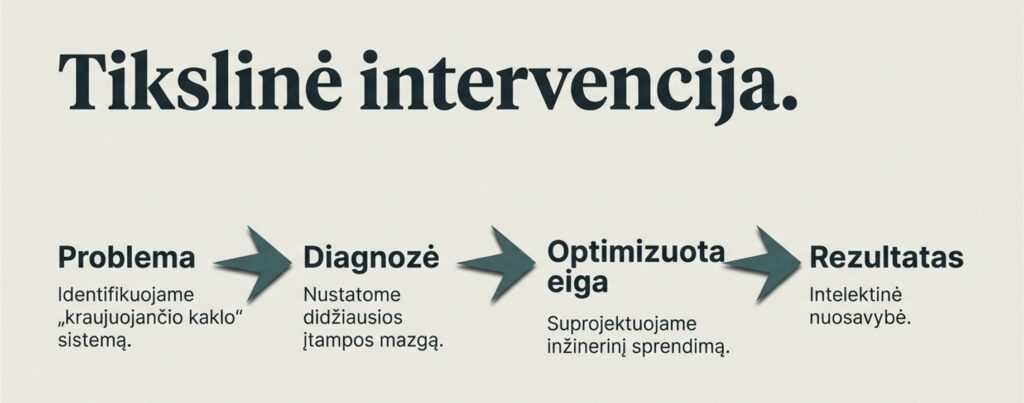 Nustokite mokėti už tai, kad jūsų komanda teoriškai „suprastų“, kas yra DI. Investuokite į gebėjimą jį funkcionaliai integruoti į kasdienes darbo eigas. Mes neskaitome teorinių paskaitų – mes vykdome tikslinę intervenciją: sprendžiame konkrečias operacines problemas, o rezultatas lieka jūsų įmonėje kaip vertinga intelektinė nuosavybė ir sklandžiai veikiantis operacinis mechanizmas.