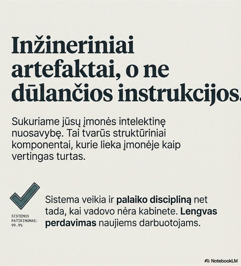 Šis skirtumas yra esminis. „Dokumentacija“ tik aprašo darbo eigą, o „natų lapai“ ją įgalina. Pirmoji renka dulkes, antroji – kiekvieną savaitę mažina operacinę trintį.