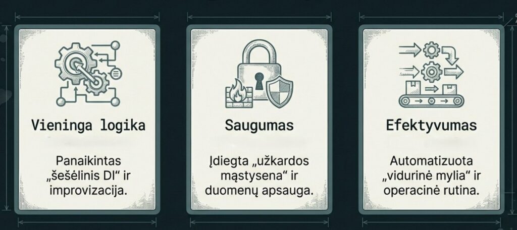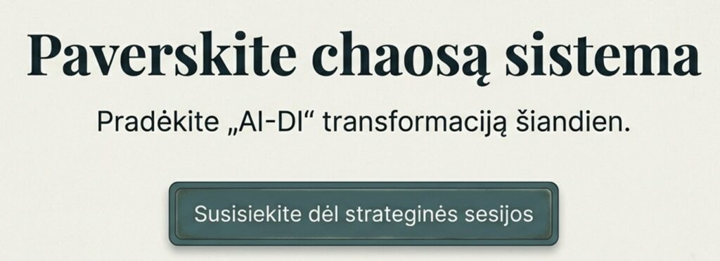 „AI-DI“ nesiūlome tiesiog „pamokų“ – mes įdiegiame kontrolės sluoksnį. Tai leidžia jūsų operacijoms tapti nebe „džiazu“, o sklandžiai veikiančia sistema.