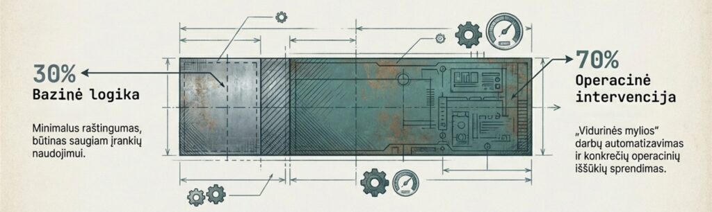 - 70 % – operacinė intervencija: gebėjimų dirbti su DI ugdymas sprendžiant konkrečius operacinius iššūkius. Tai skirta „vidurinės mylios“ darbams, kuriems šiuo metu eikvojamas geriausių jūsų specialistų laikas.