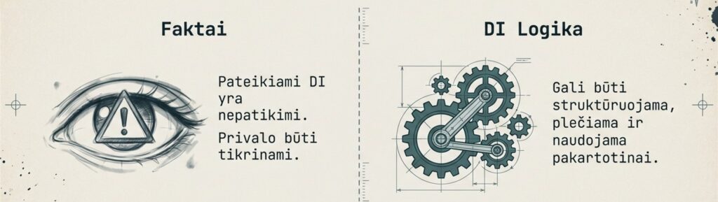 - Faktai, kuriuos pateikia DI, yra nepatikimi ir privalo būti tikrinami;