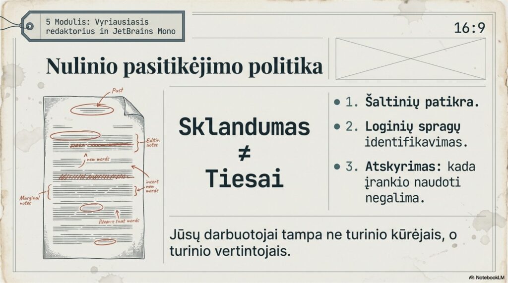Komanda mokoma ne pasyviai priimti DI sugeneruotą turinį, o jį sistemiškai valdyti: tikrinti šaltinius, užtikrinti atitiktį įmonės standartams ir identifikuoti logines spragas.